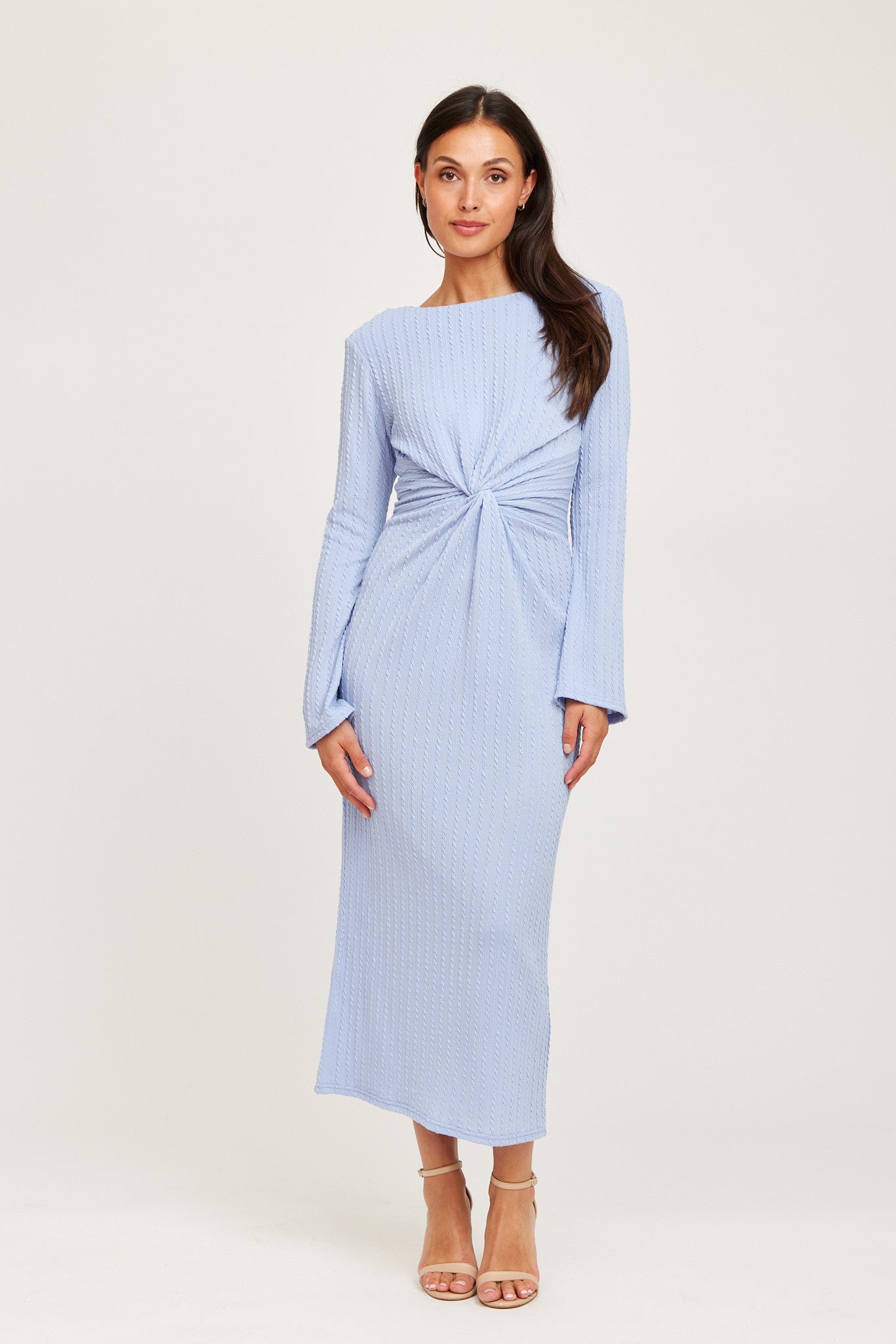 A sleek, long-sleeved maxi dress crafted in a soft light-blue fabric. Designed with flattering twisted front detail that highlights the waist, this elegant piece offers a refined, feminine silhouette perfect for both special occasions and stylish everyday wear.