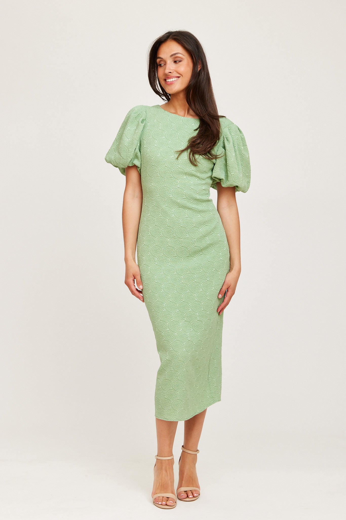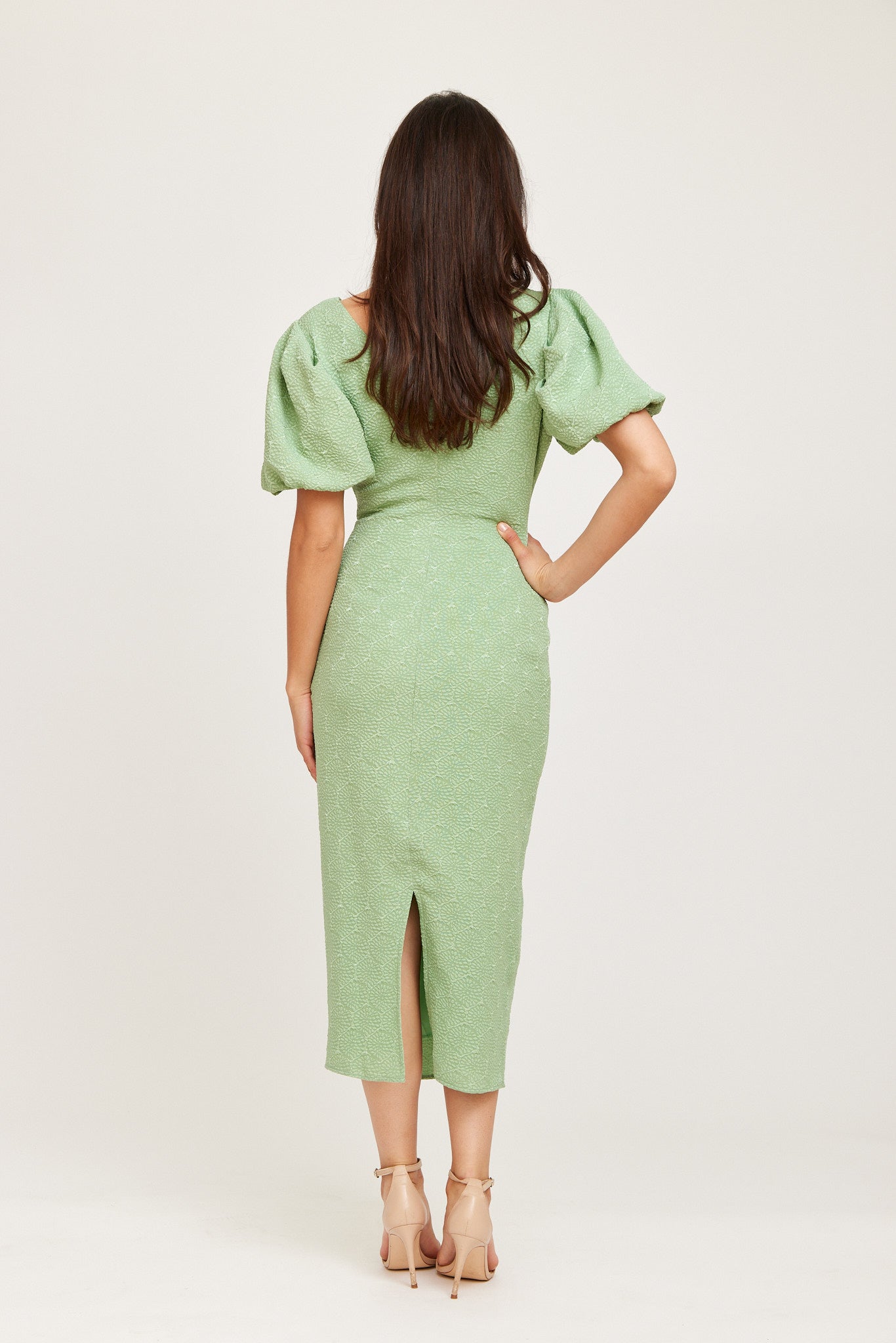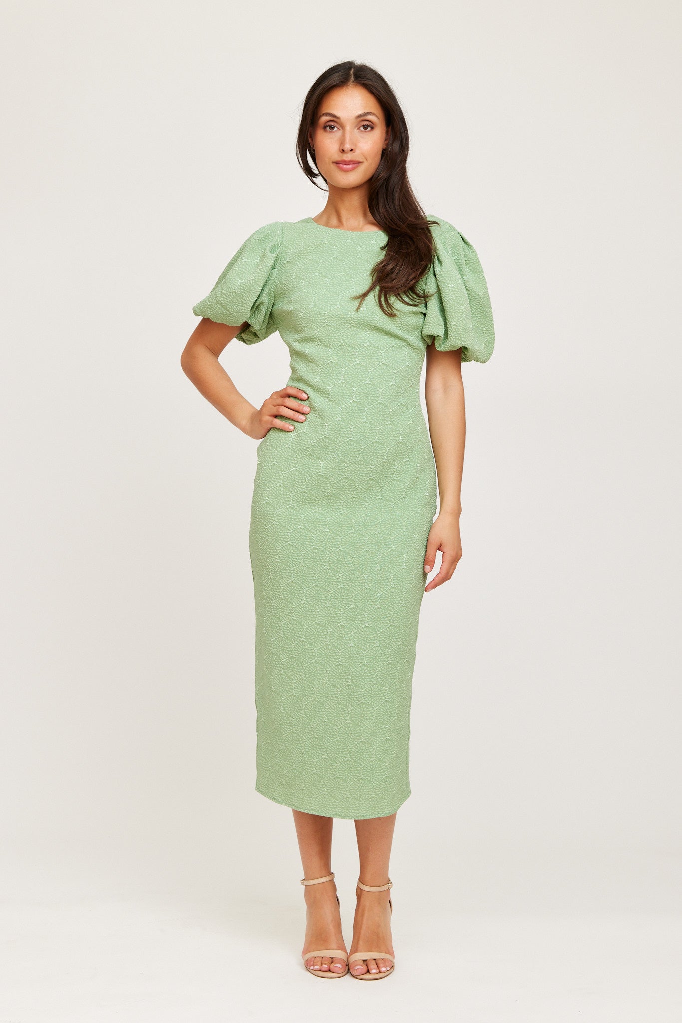 A refined midi dress crafted in a soft, textured fabric that offers both comfort and elegance. Designed with feminine puff sleeves and a flattering fitted silhouette, it highlights the waist while maintaining a sleek modern look. The clean round neckline and streamlined shape make it perfect for both daytime events and evening occasions.