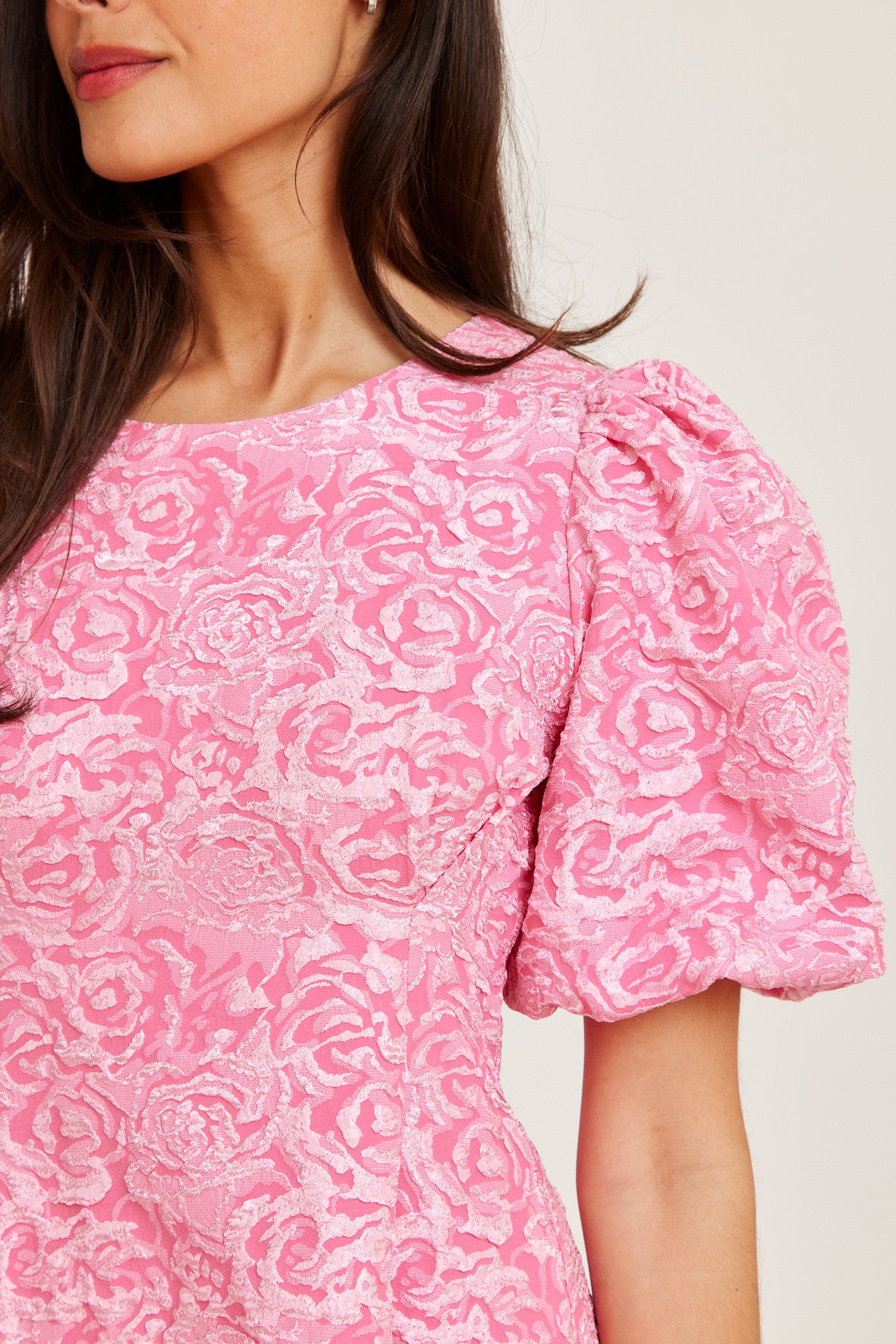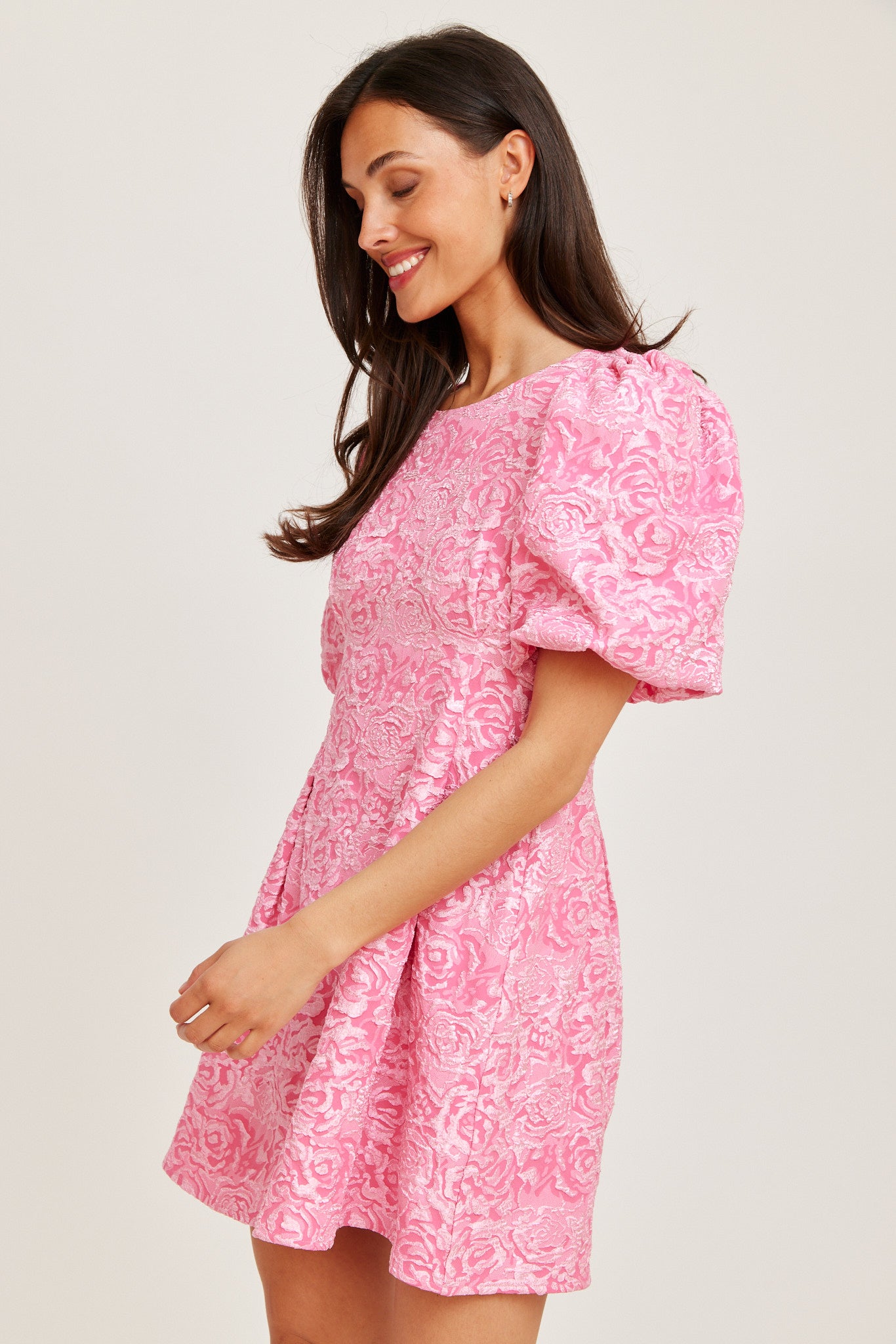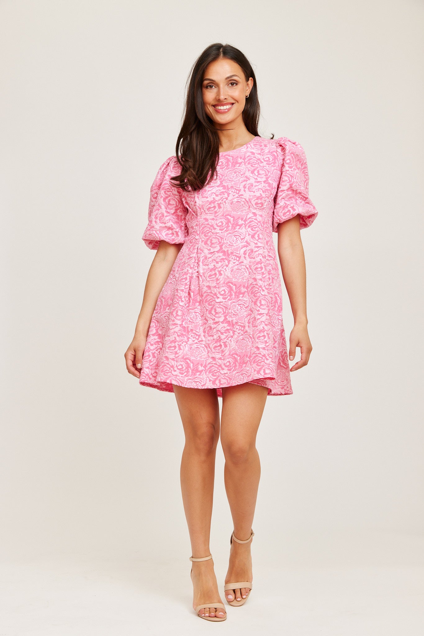 A playful pink mini dress with a subtle textured pattern. Featuring voluminous puff sleeves and a flattering A-line silhouette, this style offers a fun and feminine look.