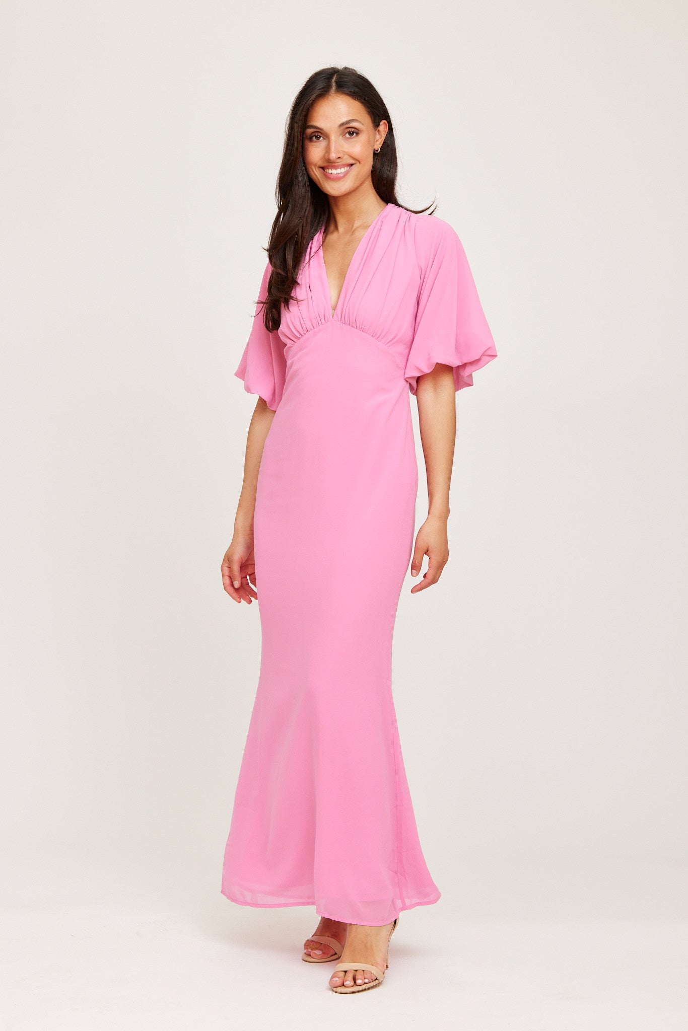 A vibrant pink maxi dress with a flattering V-neckline and soft, voluminous sleeves. Designed with a gently flared hem for an elegant silhouette, this piece is perfect for summer events, weddings, and any occasion that calls for effortless femininity.